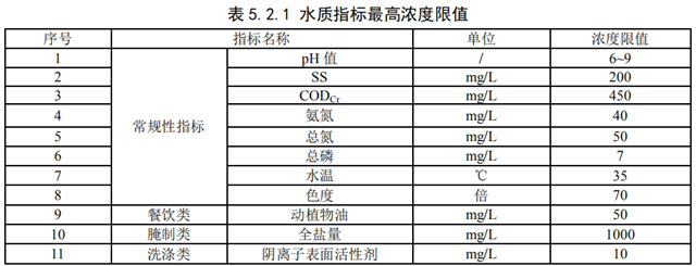 5.2.1 排水戶污水水質(zhì)常規(guī)性指標(biāo)包括 pH 值、SS、CODCr、氨氮、總氮、總磷、水溫、色度等 8 項(xiàng),其中餐飲類廢水應(yīng)增加動(dòng)植物油指標(biāo)的檢測,食品腌制類污水應(yīng)增加全鹽量指標(biāo)的檢測,洗滌類污水應(yīng)增加陰離子表面活性劑的檢測;水質(zhì)指標(biāo)最高濃度限值應(yīng)符合表 1要求。