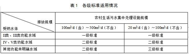 5.1.3 根據(jù)受納水體的水域功能與處理設(shè)施規(guī)模,將大于20 m³/d(含)規(guī)模的污水處理設(shè)施水污染物排放標(biāo)準(zhǔn)值分為一級標(biāo)準(zhǔn)、二級標(biāo)準(zhǔn)、三級標(biāo)準(zhǔn),各標(biāo)準(zhǔn)適用情況見表1。