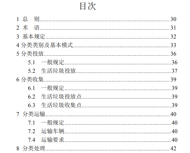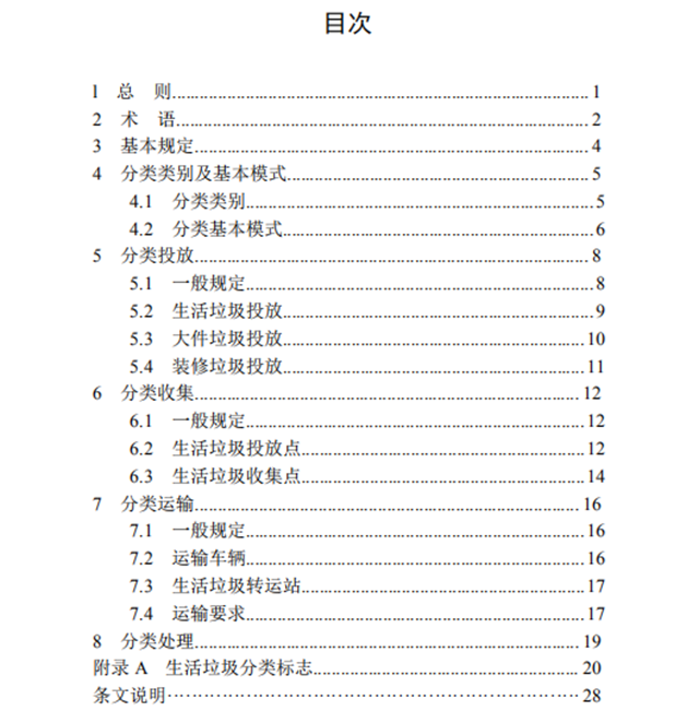本標準的主要技術內(nèi)容是:1.總則;2.術語;3.基本規(guī)定;4.分類類別及基本模式;5.分類投放;6.分類收集;7.分類運輸;8.分類處理。