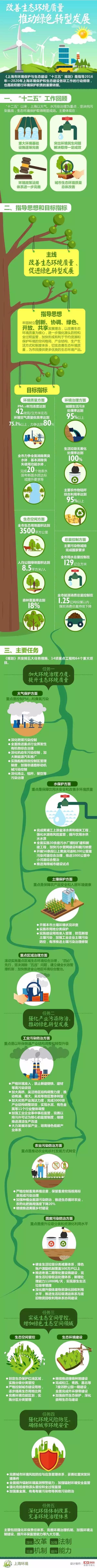 《上海市環(huán)境保護和生態(tài)建設(shè)“十三五”規(guī)劃》以“改善生態(tài)環(huán)境質(zhì)量、促進綠色轉(zhuǎn)型發(fā)展”為主線,聚焦大氣、水、土壤等重點領(lǐng)域和PM2.5、河道黑臭、生活垃圾等市民反映強烈的問題,進一步加大源頭防控和綜合治理力度?!兑?guī)劃》更加注重“綠色發(fā)展”和“底線思維”;更加注重“接軌國際”和“率先引領(lǐng)”;更加注重“深化改革”和“依法嚴管”;更加注重“科學(xué)治理”和“創(chuàng)新驅(qū)動”??傮w目標是到2020年,本市生態(tài)環(huán)境質(zhì)量明顯改善,環(huán)境治理體系和治理能力現(xiàn)代化取得重大進展,綠色生產(chǎn)和綠色生活水平明顯提升,社會公眾對生態(tài)環(huán)境的滿意度進一步提升。對應(yīng)上述目標,《規(guī)劃》提出了環(huán)境質(zhì)量、環(huán)境治理、生態(tài)空間、總量控制等4大類21項具體指標,其中15項為約束性指標?!兑?guī)劃》還明確了5大任務(wù)措施、14項重點工程和64個重大項目。