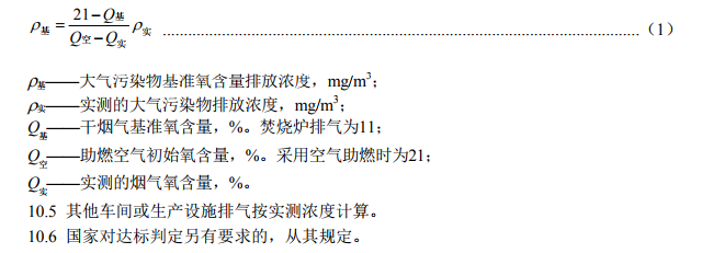 10.4 正常工況下,對(duì)于焚燒爐排氣,應(yīng)同時(shí)對(duì)煙氣中氧含量進(jìn)行監(jiān)測(cè),實(shí)測(cè)大氣污染物排放濃度應(yīng)按公式(1)換算為基準(zhǔn)氧含量狀態(tài)下的基準(zhǔn)排放濃度,并以此作為判定排放是否達(dá)標(biāo)的依據(jù)。