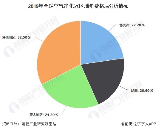 從全球空氣凈化器區(qū)域消費格局來看,2019年北美和歐洲的市場份額占比較大,分別為22.70%和20.60%,亞太地區(qū)市場份額占比為24.20%,已經超過北美洲和歐洲,其他區(qū)域占比之和為32.50%。