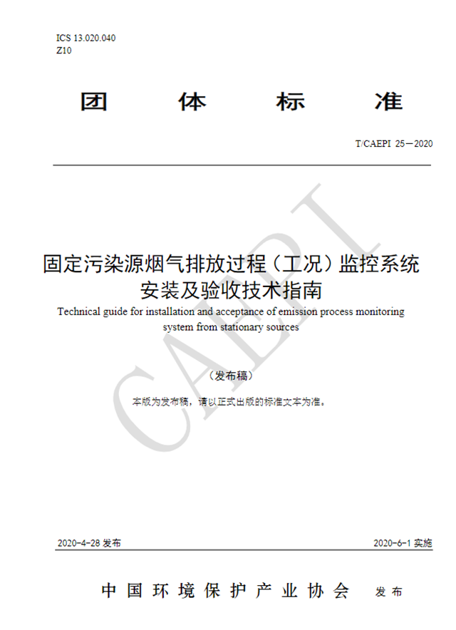 原標(biāo)題:關(guān)于發(fā)布《固定污染源煙氣排放過程(工況)監(jiān)控系統(tǒng)安裝及驗收技術(shù)指南》(T/CAEPI-25-2020)的公告