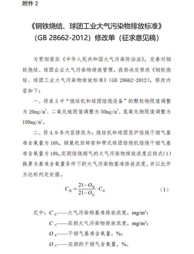 2.《鋼鐵燒結(jié)、球團(tuán)工業(yè)大氣污染物排放標(biāo)準(zhǔn)》(GB 28662-2012)修改單(征求意見稿)