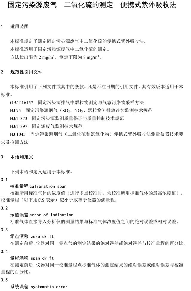 為貫徹《中華人民共和國環(huán)境保護(hù)法》和《中華人民共和國大氣污染防治法》,保護(hù)生態(tài)環(huán)境,保障人體健康,規(guī)范固定污染源廢氣中二氧化硫的便攜式測(cè)定方法,制定本標(biāo)準(zhǔn)。本標(biāo)準(zhǔn)規(guī)定了測(cè)定固定污染源廢氣中二氧化硫的便攜式紫外吸收法。本標(biāo)準(zhǔn)的附錄A為資料性附錄。本標(biāo)準(zhǔn)為首次發(fā)布。