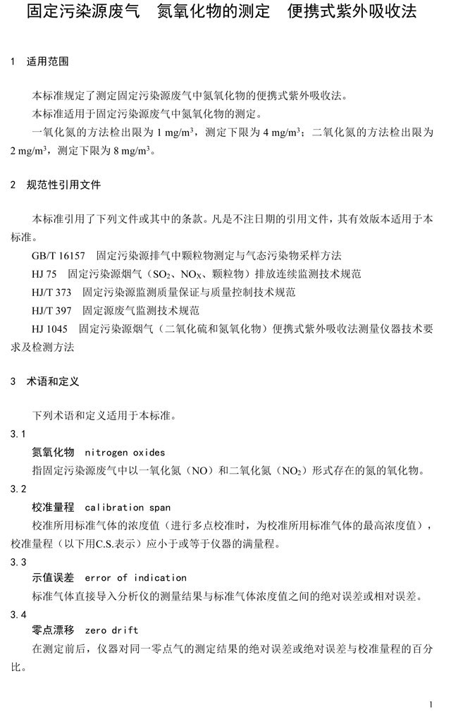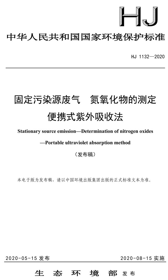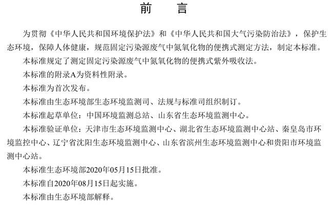 為貫徹《中華人民共和國環(huán)境保護法》和《中華人民共和國大氣污染防治法》,保護生態(tài)環(huán)境,保障人體健康,規(guī)范固定污染源廢氣中氮氧化物的便攜式測定方法,制定本標準。本標準規(guī)定了測定固定污染源廢氣中氮氧化物的便攜式紫外吸收法。本標準的附錄A為資料性附錄。本標準為首次發(fā)布。