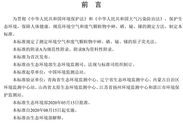 為貫徹《中華人民共和國環(huán)境保護(hù)法》和《中華人民共和國大氣污染防治法》,保護(hù)生態(tài)環(huán)境,保障人體健康,規(guī)范環(huán)境空氣和廢氣顆粒物中砷、硒、鉍、銻的測定方法,制定本標(biāo)準(zhǔn)。本標(biāo)準(zhǔn)規(guī)定了測定環(huán)境空氣和廢氣顆粒物中砷、硒、鉍、銻的原子熒光法。本標(biāo)準(zhǔn)的附錄A為規(guī)范性附錄,附錄B為資料性附錄。本標(biāo)準(zhǔn)為首次發(fā)布。