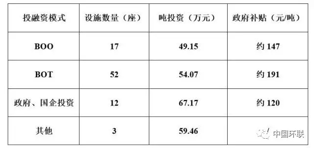 不同投融資模式餐廚垃圾處理設施的建設數(shù)量及噸投資情況