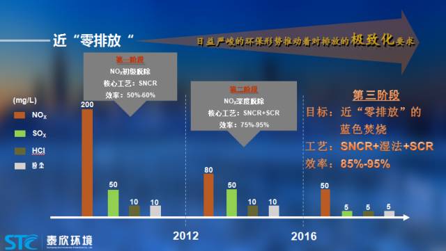 第一個(gè)階段,在2012年之前,我們比較傳統(tǒng)的處理工藝是SNCR,NOX初級(jí)脫除效率是50%-60%;第二個(gè)階段,2012年以后,由于引用了SCR,排放標(biāo)準(zhǔn)得到進(jìn)一步的降低,NOX深度脫除效率達(dá)75%-95%;第三個(gè)階段,到2016年,國(guó)家環(huán)保管理總體收緊,煙氣的排放標(biāo)準(zhǔn)越來(lái)越嚴(yán),要求近“零排放”的藍(lán)色焚燒。對(duì)于我們來(lái)說(shuō),就需要將工藝做進(jìn)一步改進(jìn)。我們判斷,低溫的SCR處理和濕法處理工藝的價(jià)值會(huì)凸顯出來(lái)。