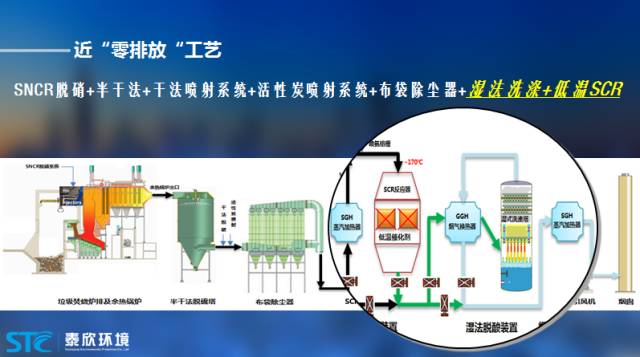 前面一段基本上是標(biāo)準(zhǔn)的半干法工藝,后面添加了一些新的東西。一個(gè)是SCR,降低氮氧化物,在SCR的入口有一個(gè)SGH蒸汽加熱器,主要是為了達(dá)到除塵器的溫度要求,大概能提高30度-50度左右。SCR的出口連接濕法處理設(shè)備,進(jìn)一步脫硫脫塵。