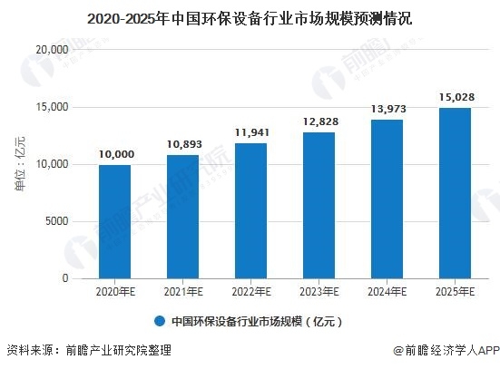 預(yù)計2020年,環(huán)保裝備制造業(yè)市場規(guī)模將達(dá)到10000億元,2025年市場規(guī)模將達(dá)到15028億元。
