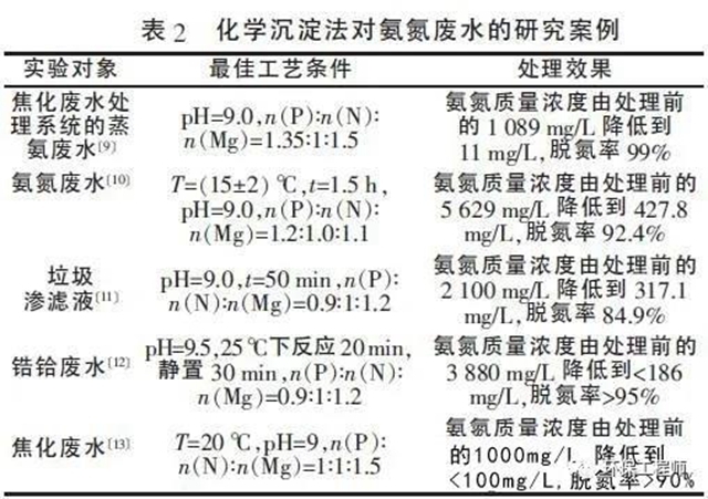 化學(xué)沉淀法的優(yōu)點主要表現(xiàn)在:工藝設(shè)計操作相對簡單;反應(yīng)穩(wěn)定,受外界環(huán)境影響小,抗沖擊能力強;脫氮率高,效果明顯,生成的磷酸銨鎂可作為無機復(fù)合肥使用,解決了氮的回收和二次污染的問題,具有良好的經(jīng)濟和環(huán)境效益。磷酸銨鎂沉淀法適用于處理氨氮濃度較高的工業(yè)廢水, 表2 總結(jié)了一些使用化學(xué)沉淀法處理氨氮廢水的案例。