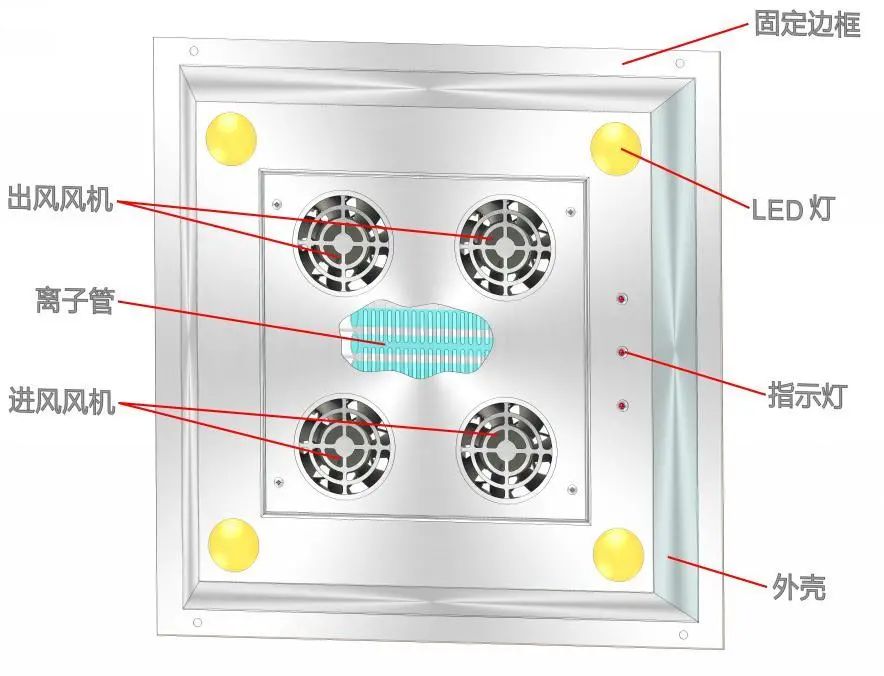 本產(chǎn)品安裝于室內(nèi)吊頂天花板上,內(nèi)部為離子管和紫外燈管雙重消毒過程,在四組節(jié)能靜音風(fēng)機(jī)作用下,通過使室內(nèi)空氣循環(huán)經(jīng)過離子與紫外過程,紫外燈用來破壞細(xì)菌病毒中的DNA(脫氧核糖核酸)或RNA(核糖核酸)的分子結(jié)構(gòu),造成生長性細(xì)胞死度亡和(或)再生性細(xì)胞死亡,達(dá)到殺菌消毒的效果;離子發(fā)生器同時產(chǎn)生的正離子與負(fù)離子在空氣中進(jìn)行正負(fù)電荷中和的瞬間產(chǎn)生巨大的能量釋放,從而導(dǎo)致其周圍細(xì)菌結(jié)構(gòu)的改變或能量的轉(zhuǎn)換,從而致使細(xì)菌死亡,實(shí)現(xiàn)其殺菌的作用。由于負(fù)離子的數(shù)量大于正離子的數(shù)量,因此多余的負(fù)離子仍然飄浮在空氣中,可以達(dá)到消煙、除塵、消除異味、改善空氣的品質(zhì),以改善室內(nèi)環(huán)境。