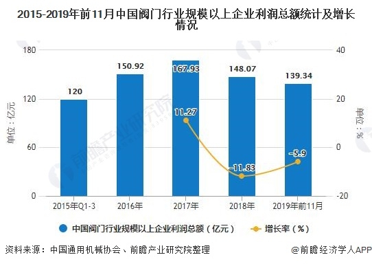 2015-2017年,我國閥門行業(yè)規(guī)模以上企業(yè)主營收入規(guī)模持續(xù)上升,2017年達(dá)到2486.3億元,同比增長8.17%,達(dá)到近5年來最高;2018-2019年,受到貿(mào)易戰(zhàn)影響,國際市場受阻,2019年1-11月,我國閥門行業(yè)柜上企業(yè)實(shí)現(xiàn)主營收入1788.23億元,雖然營收持續(xù)下滑,但增速出現(xiàn)回升趨勢(shì)。