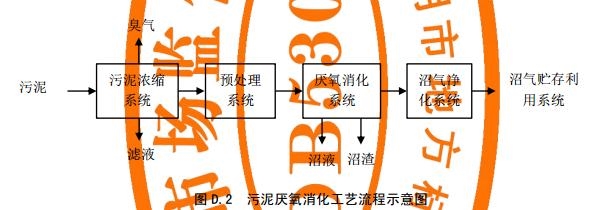 污泥脫水產(chǎn)生的主要污染物是污泥濃縮和污泥脫水工段產(chǎn)生的廢水和廢氣,廢水中包括污泥濃縮脫水過程中產(chǎn)生的上清液和濾液(包括沖洗水),廢氣是集泥池、濃縮池和脫水機房產(chǎn)生的惡臭。污泥厭氧消化工藝流程示意見圖D.2。