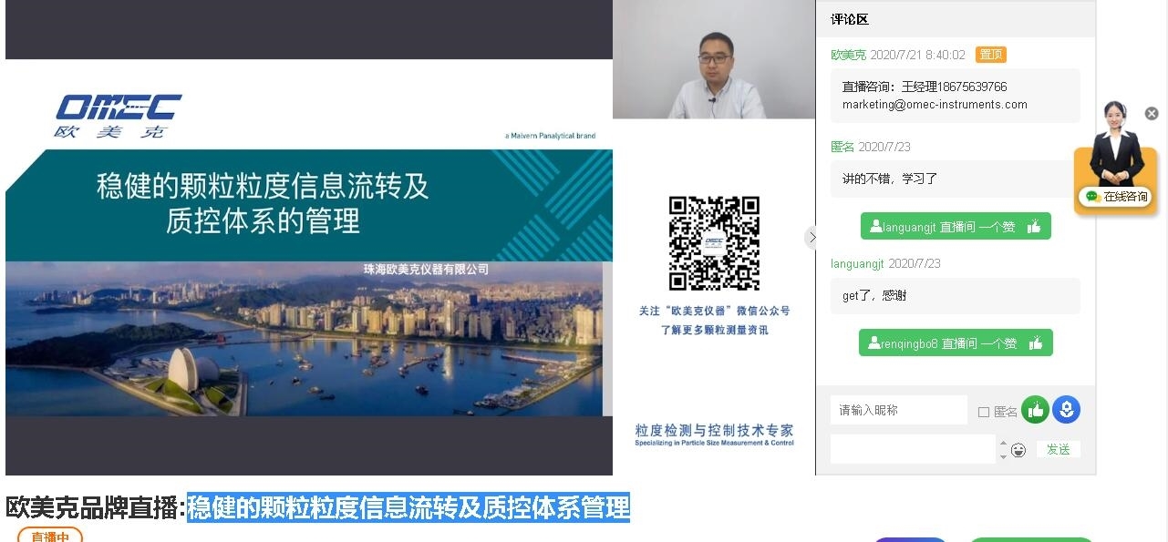 珠海歐美克(←點(diǎn)擊進(jìn)入)直播間為大家?guī)砹朔€(wěn)健的顆粒粒度信息流轉(zhuǎn)及質(zhì)控體系管理課程講解。
