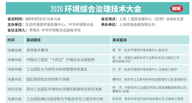 由生態(tài)環(huán)境部環(huán)境發(fā)展中心聯(lián)合中華環(huán)保聯(lián)合會(huì)將于2020年8月31日在上海國(guó)家會(huì)展中心組織召開“2020環(huán)境綜合治理技術(shù)大會(huì)”及系列活動(dòng),聚焦化工工業(yè)園區(qū)第三方綜合治理,關(guān)注工業(yè)企業(yè)廢水、廢氣、固體廢棄物處理處置問題和管理能力提升,探索開展環(huán)境綜合治理托管、環(huán)保管家、環(huán)境顧問等服務(wù)模式。