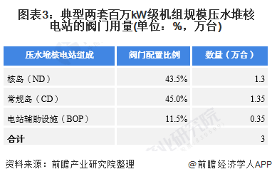 從中國核電機(jī)組的發(fā)展來看,核電閥門的需求量遠(yuǎn)高于同容量級的火電站。以容量為80萬千瓦的核電站為例,通徑DN25-1000mm的閥門需求量為8000-10000臺,為同類火電站的2-3倍。一座有2套百萬kW級核電機(jī)組的核電站需各類閥門3萬臺,其中核島(NI)用閥門1.3萬臺,常規(guī)島(CI)用閥門1.35萬臺,電站輔助設(shè)施(BOP)用閥門0.35萬臺。