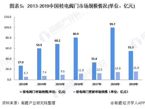 而原有舊核電站的維修保養(yǎng)需求則是與已經(jīng)投入運(yùn)行中的核電站數(shù)量息息相關(guān),市場規(guī)模相對比較穩(wěn)定。2019年,中國核電閥門市場規(guī)模為55.3億元,其中核電閥門更新市場規(guī)模為15.9億元。