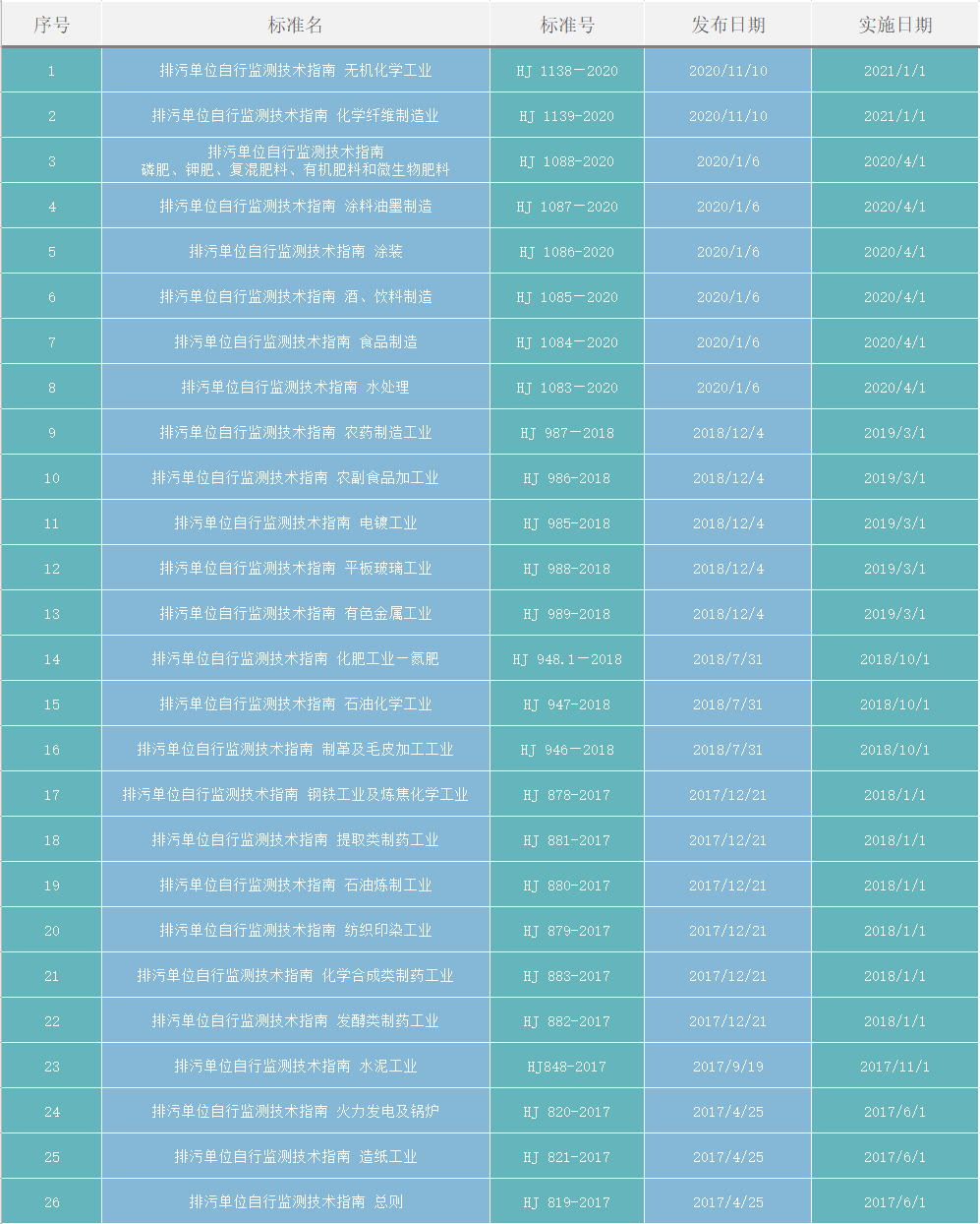 排污單位自行監(jiān)測26項(xiàng)標(biāo)準(zhǔn)匯總 2018年開始密集實(shí)施