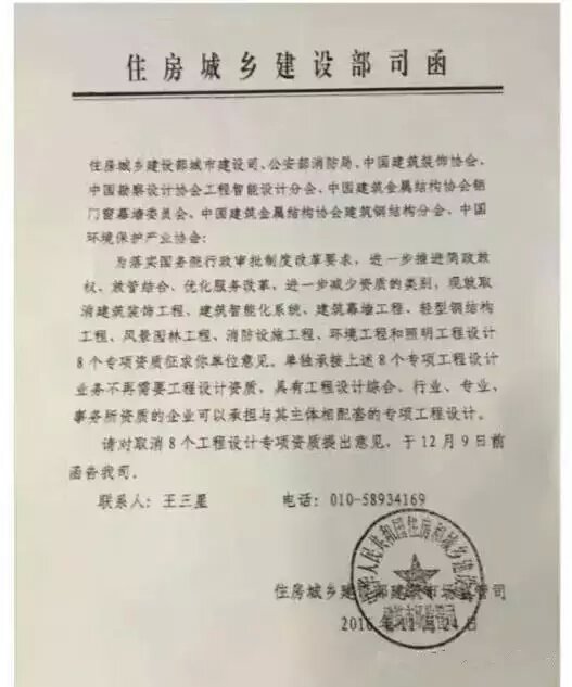 8個工程設(shè)計專項資質(zhì)包括:建筑裝飾工程,建筑智能化系統(tǒng),建筑幕墻工程,輕型鋼結(jié)構(gòu)工程,照明工程,消防設(shè)施工程,風景園林工程和環(huán)境工程,向城市建設(shè)司、公安部消防局,中國建筑裝飾協(xié)會,中國勘察設(shè)計協(xié)會工程智能設(shè)計分會,中國建筑金屬結(jié)構(gòu)協(xié)會,中國建筑環(huán)境保護產(chǎn)業(yè)協(xié)會發(fā)出此征求意見函,要求在12月9日之前給予回復。
