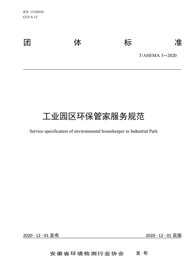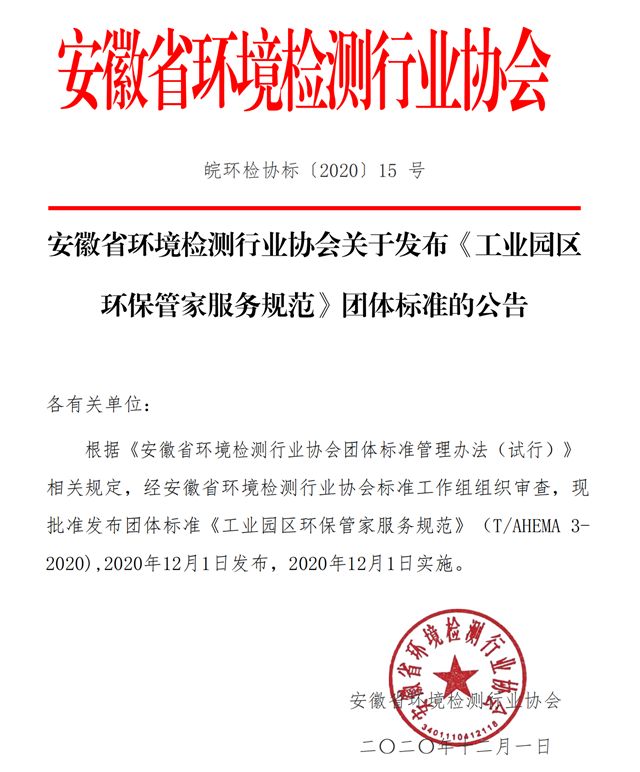 根據(jù)《安徽省環(huán)境檢測行業(yè)協(xié)會團體標準管理辦法(試行)》 相關(guān)規(guī)定,經(jīng)安徽省環(huán)境檢測行業(yè)協(xié)會標準工作組組織審查,現(xiàn)批準發(fā)布團體標準《工業(yè)園區(qū)環(huán)保管家服務(wù)規(guī)范》(T/AHEMA 3-2020),2020年12月1日發(fā)布,2020年12月1日實施。