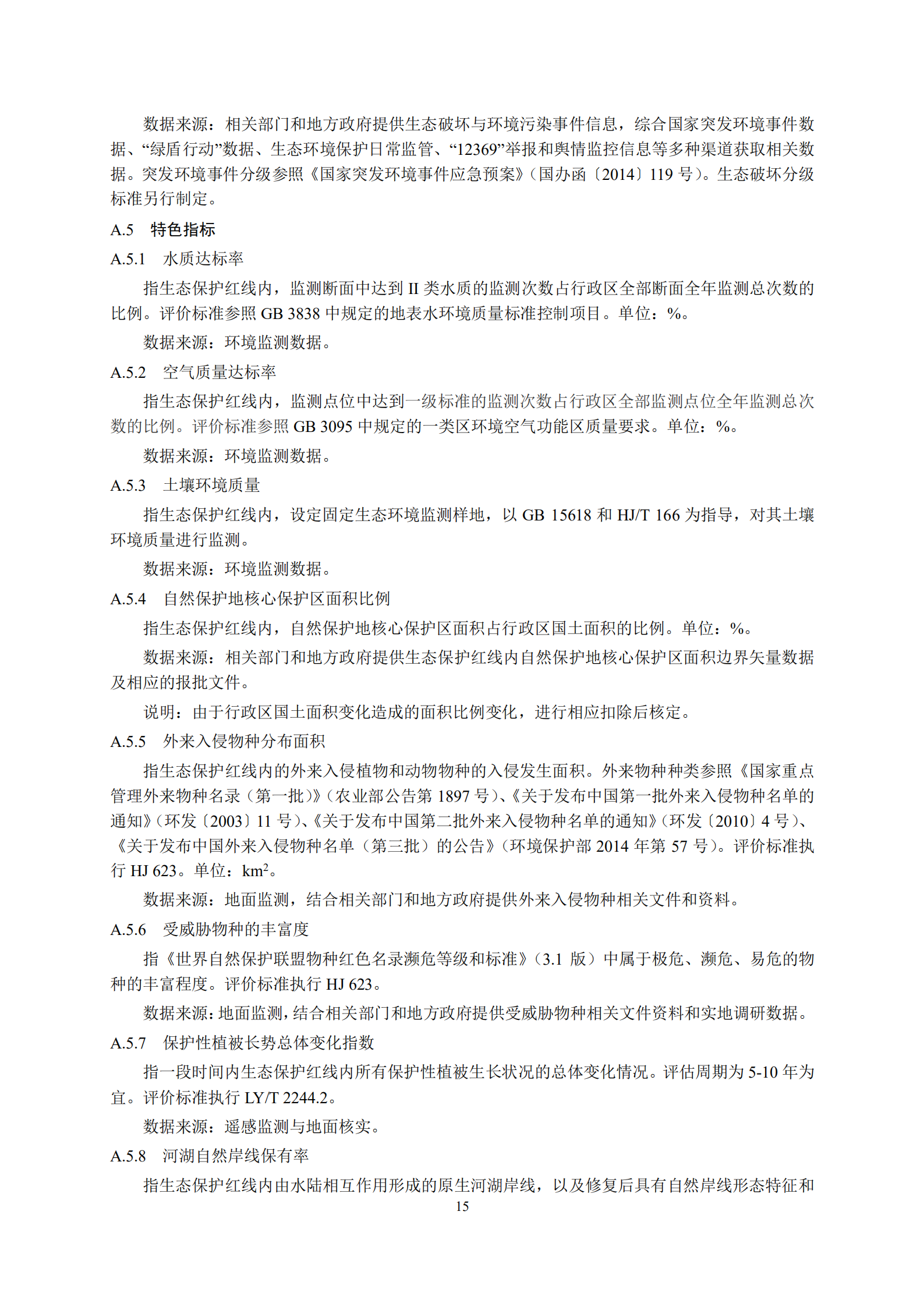 為貫徹落實(shí)《中華人民共和國(guó)環(huán)境保護(hù)法》《中共中央辦公廳 國(guó)務(wù)院辦公廳關(guān)于劃定并嚴(yán)守生態(tài)保護(hù)紅線的若干意見(jiàn)》要求,規(guī)范生態(tài)保護(hù)紅線保護(hù)成效評(píng)估的技術(shù)要求,制定本標(biāo)準(zhǔn)。本標(biāo)準(zhǔn)規(guī)定了生態(tài)保護(hù)紅線保護(hù)成效評(píng)估的評(píng)估周期、評(píng)估目標(biāo)與方式、評(píng)估指標(biāo)與計(jì)算方法、綜合指數(shù)計(jì)算方法與分級(jí)標(biāo)準(zhǔn)的具體要求。本標(biāo)準(zhǔn)附錄 A、C、E 為資料性附錄,附錄 B、D 為規(guī)范性附錄。本標(biāo)準(zhǔn)為首次發(fā)布。