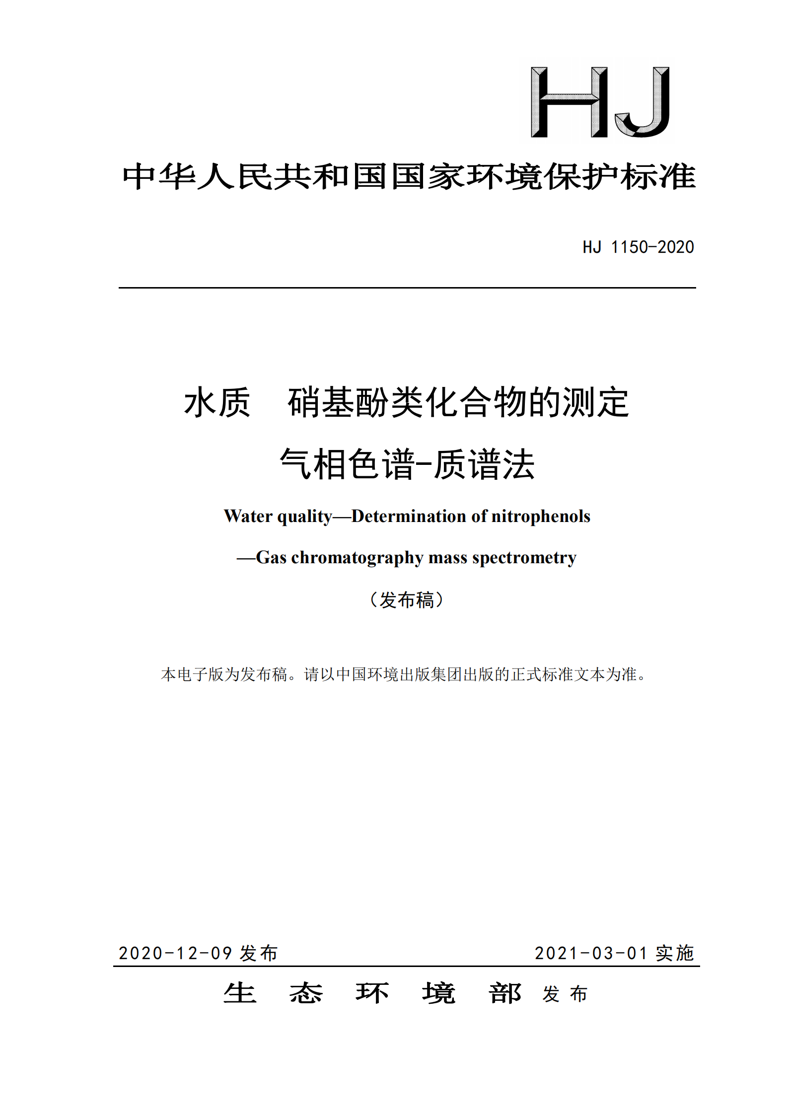 《水質(zhì) 硝基酚類化合物的測定 氣相色譜-質(zhì)譜法》(HJ 1150-2020)