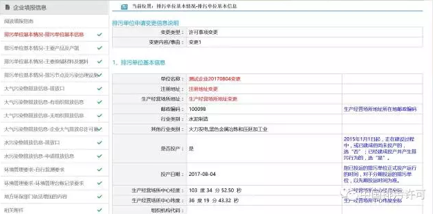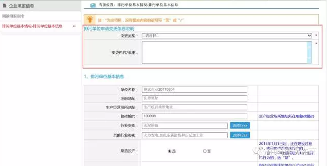 (2)排污單位申請變更時,需先填寫變更類型和變更內(nèi)容/事由。前一次排污許可證申請信息自動帶入,排污單位可在原有信息基礎(chǔ)上填寫或修改變更內(nèi)容。