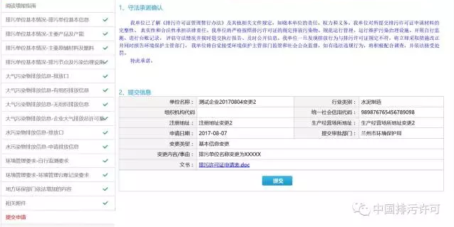 排污單位填寫完所有信息后,點(diǎn)擊“提交”按鈕,即完成排污許可證變更申報。系統(tǒng)會對變更內(nèi)容進(jìn)行標(biāo)識,綠色文字為排污單位變更過程中新增內(nèi)容,紅色文字為排污單位變更過程中修改內(nèi)容。