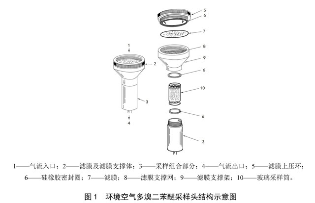 按HJ 194和HJ 691要求采樣,應對采樣現(xiàn)場的氣溫、氣壓、風速、風向等氣象參數(shù)進行測定,并對采樣過程中的技術參數(shù)進行記錄。采樣前確認石英/玻璃纖維濾膜(5.17)無破損后用鑷子輕輕夾住濾膜邊緣安裝在濾膜支撐網(wǎng)上,玻璃采樣筒安裝2塊 PUF(5.18),并安裝到采樣組合部分,按圖1依次安裝采樣頭,然后將采樣頭安裝在采樣器上并確保儀器穩(wěn)固。每次采樣前應進行采樣系統(tǒng)的氣密性和儀器運行穩(wěn)定性等檢查,確保儀器符合要求后再進行采樣。采樣結束后,關閉電源,卸下采樣頭,將采樣頭帶到干凈、無污染和避光的地方,取下濾膜,采樣塵面向里對折,取出玻璃采樣筒。兩者分別用鋁箔包好,放入保存盒中密封保存。采樣后的濾膜和PUF為環(huán)境空氣樣品。