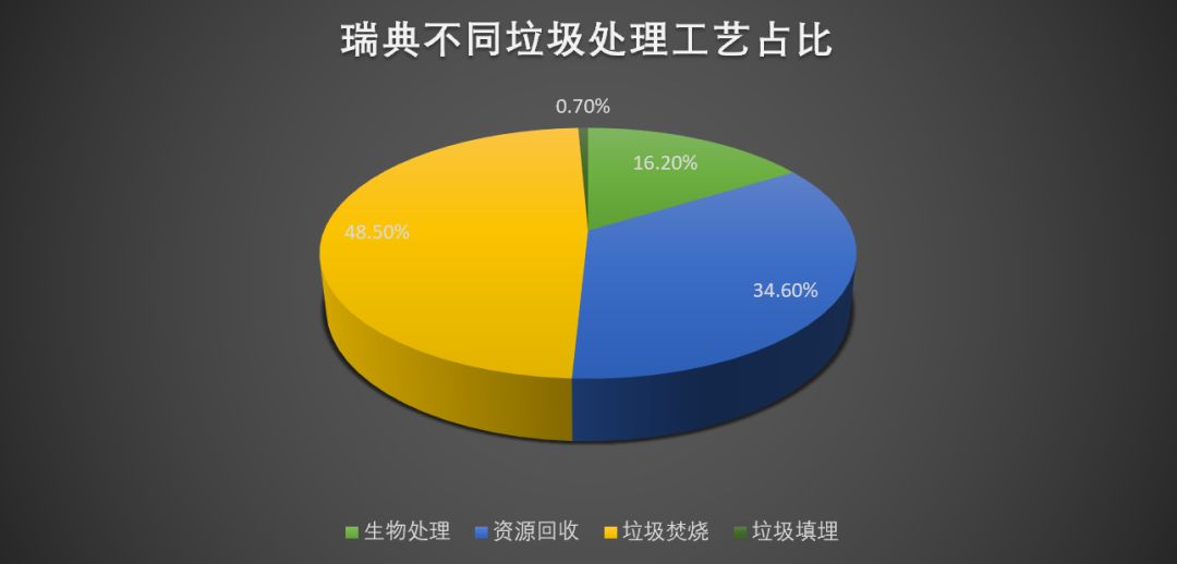 瑞典每年處理的生活垃圾大約在 466 萬(wàn)噸,全國(guó)人均垃圾年產(chǎn)生量為 467 千克。在瑞典,幾乎所有的生活垃圾都被回收、加工和處理,或是作為能源使用。在瑞典的生活垃圾中,循環(huán)利用為 161.5 萬(wàn)噸,占總量的 34.6% ;將有機(jī)垃圾變?yōu)槎逊?、沼氣或混合肥料的生物處理量?75.7 萬(wàn)噸,占總量的 16.2% ;將垃圾轉(zhuǎn)化為熱能和電能的焚燒處理量為 226.3 萬(wàn)噸,占總量的 48.5% ;沒有利用價(jià)值被填埋處理的為 3.1 萬(wàn)噸,僅占總量的 0.7%。