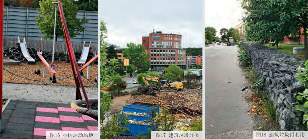 在城市的小區(qū)中還設(shè)有舊物品回收間(圖 15),市民們可以把家中不用的家具、衣物、玩具、書等舊物投放到不同的塑料桶內(nèi),由專業(yè)公司收取、處理和再利用。小區(qū)運(yùn)動(dòng)場(chǎng)地(圖 16) 利用舊輪胎等制作運(yùn)動(dòng)器材,做到物盡其用,減少了垃圾量。