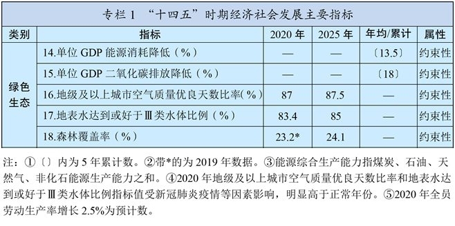 ——生態(tài)文明建設(shè)實(shí)現(xiàn)新進(jìn)步。國(guó)土空間開發(fā)保護(hù)格局得到優(yōu)化,生產(chǎn)生活方式綠色轉(zhuǎn)型成效顯著,能源資源配置更加合理、利用效率大幅提高,單位國(guó)內(nèi)生產(chǎn)總值能源消耗和二氧化碳排放分別降低13.5%、18%,主要污染物排放總量持續(xù)減少,森林覆蓋率提高到24.1%,生態(tài)環(huán)境持續(xù)改善,生態(tài)安全屏障更加牢固,城鄉(xiāng)人居環(huán)境明顯改善。