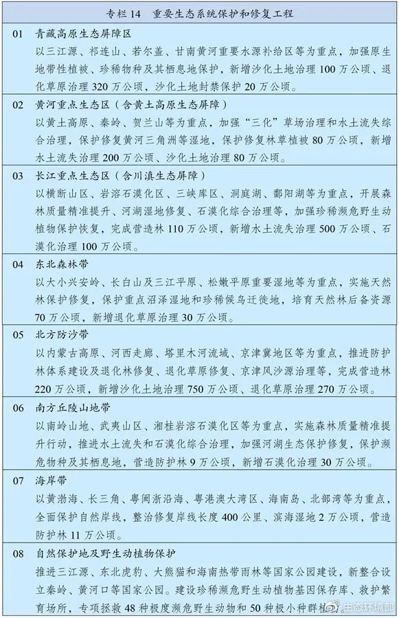 強(qiáng)化國(guó)土空間規(guī)劃和用途管控,劃定落實(shí)生態(tài)保護(hù)紅線、永久基本農(nóng)田、城鎮(zhèn)開發(fā)邊界以及各類海域保護(hù)線。以國(guó)家重點(diǎn)生態(tài)功能區(qū)、生態(tài)保護(hù)紅線、國(guó)家級(jí)自然保護(hù)地等為重點(diǎn),實(shí)施重要生態(tài)系統(tǒng)保護(hù)和修復(fù)重大工程,加快推進(jìn)青藏高原生態(tài)屏障區(qū)、黃河重點(diǎn)生態(tài)區(qū)、長(zhǎng)江重點(diǎn)生態(tài)區(qū)和東北森林帶、北方防沙帶、南方丘陵山地帶、海岸帶等生態(tài)屏障建設(shè)。加強(qiáng)長(zhǎng)江、黃河等大江大河和重要湖泊濕地生態(tài)保護(hù)治理,加強(qiáng)重要生態(tài)廊道建設(shè)和保護(hù)。全面加強(qiáng)天然林和濕地保護(hù),濕地保護(hù)率提高到55%??茖W(xué)推進(jìn)水土流失和荒漠化、石漠化綜合治理,開展大規(guī)模國(guó)土綠化行動(dòng),推行林長(zhǎng)制??茖W(xué)開展人工影響天氣活動(dòng)。推行草原森林河流湖泊休養(yǎng)生息,健全耕地休耕輪作制度,鞏固退耕還林還草、退田還湖還濕、退圍還灘還海成果。
