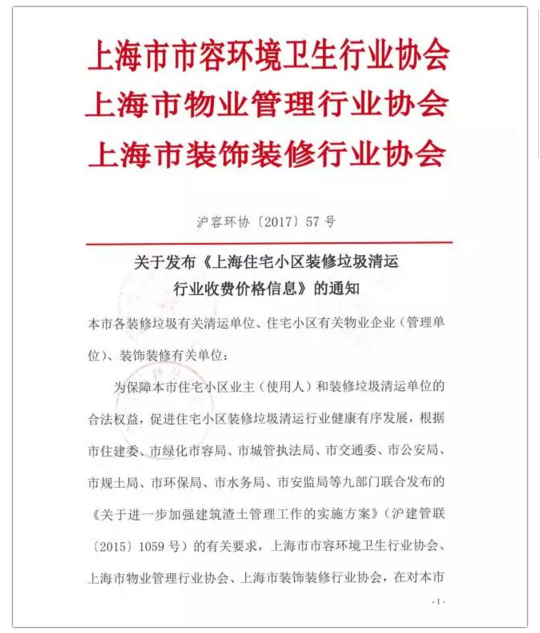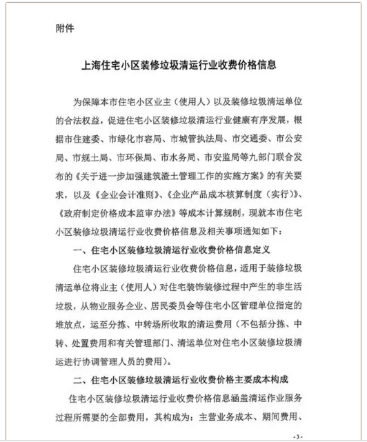 8月17日,《上海住宅小區(qū)裝修垃圾清運行業(yè)收費價格信息》(下稱《價格信息》)公布,《價格信息》明確了住宅小區(qū)裝修垃圾清運行業(yè)收費價格信息的定義,明確收費價格主要成本構(gòu)成、計價方式、標(biāo)準(zhǔn)以及收費主體。住宅小區(qū)裝修垃圾清運,根據(jù)首次和非首次裝飾裝修、基本面積等標(biāo)準(zhǔn)計價,此外,機關(guān)、企事業(yè)單位裝飾裝修垃圾清運處置費將根據(jù)清運、分揀等環(huán)節(jié),按市場化、全成本要素,協(xié)商收取。