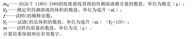 試樣中總磷的含量以質(zhì)量分?jǐn)?shù)w2計,按式(5)計算: