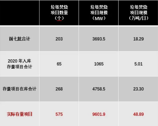 可再生能源發(fā)電項目“存量”、“新增”以2020年1月20日為界進(jìn)行劃分。存量項目中已在原有目錄內(nèi)的(前七批),直接進(jìn)入新目錄,并按原有規(guī)則進(jìn)行補貼。據(jù)E20研究院數(shù)據(jù)統(tǒng)計,符合條件的存量項目合計575個,涉及處理能力48.89萬噸/日。而截至2020年底進(jìn)入目錄的共有268個項目,涉及處理能力23.30萬噸/日。