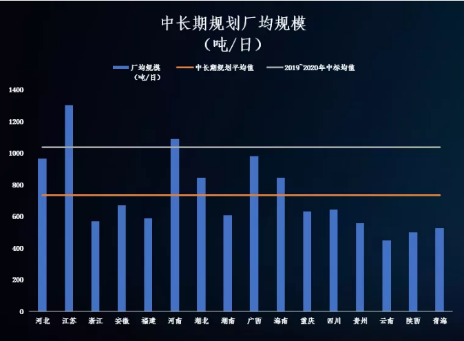 E20研究院通過對各省中長期規(guī)劃的分析發(fā)現(xiàn),中長期規(guī)劃中新增生活垃圾焚燒項目的廠均規(guī)模已將從2019~2020年的平均值1037噸/日下降至736噸/日,降幅達(dá)到30%。