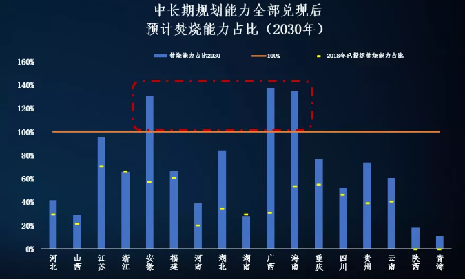 我們認(rèn)為在未來5~10年的生活垃圾焚燒市場中將更多的充斥著小體量的縣鎮(zhèn)項目,大項目、好項目將減少。另一方面,我們對各省中長期規(guī)劃的本底值可靠性進(jìn)行了進(jìn)一步考察,發(fā)現(xiàn)有些省份若以起中長期規(guī)劃推演,至其規(guī)劃期截止,若全部規(guī)劃能力兌現(xiàn),焚燒能力已經(jīng)超過了當(dāng)?shù)厣罾a(chǎn)生總量的100%。若該省份人口不能如長三角和珠三角地區(qū)在未來發(fā)生強烈吸納作用,則實際上仍存在落地風(fēng)險。