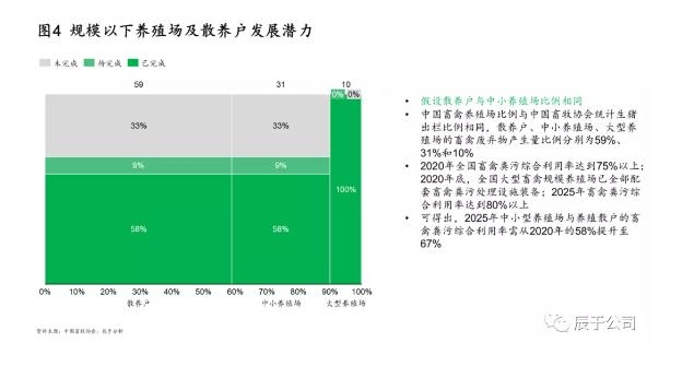 實(shí)現(xiàn)以上提到的目標(biāo)(到2025年畜禽廢棄物綜合利用率達(dá)到80%),我們估算中小型養(yǎng)殖場(chǎng)與養(yǎng)殖散戶的畜禽糞污綜合利用率需從當(dāng)前的58%提升至67%(如圖4,假設(shè)中國畜禽養(yǎng)殖場(chǎng)比例與中國畜牧協(xié)會(huì)統(tǒng)計(jì)生豬出欄比例相同[1]),中小型養(yǎng)殖場(chǎng)與養(yǎng)殖散戶將成為未來發(fā)展重點(diǎn)。
