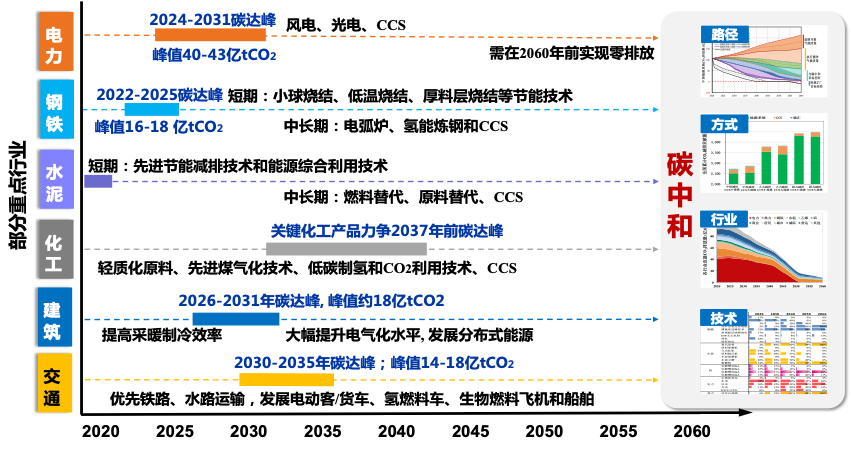 水泥、鋼鐵、電力行業(yè)碳排放率先達峰。水泥行業(yè)仍處于震蕩期,謹(jǐn)防其碳排放出現(xiàn)反彈。鋼鐵行業(yè)力爭在“十四五”初期達峰,2030年噸鋼碳排放較2020年至少下降24%。電力行業(yè)力爭在“十四五”期間碳排放達峰,最晚不遲于2030年,峰值為40-43億噸,2030年平均每度電碳排放較2020年至少下降25%。化工行業(yè)乙烯、甲醇、電石等關(guān)鍵產(chǎn)品碳排放將繼續(xù)增長,其達峰時間可以略晚于全國碳達峰時間。建筑、交通等民生部門可以在“十五五”甚至“十六五”期間達峰,力爭實現(xiàn)2030年前碳達峰。
