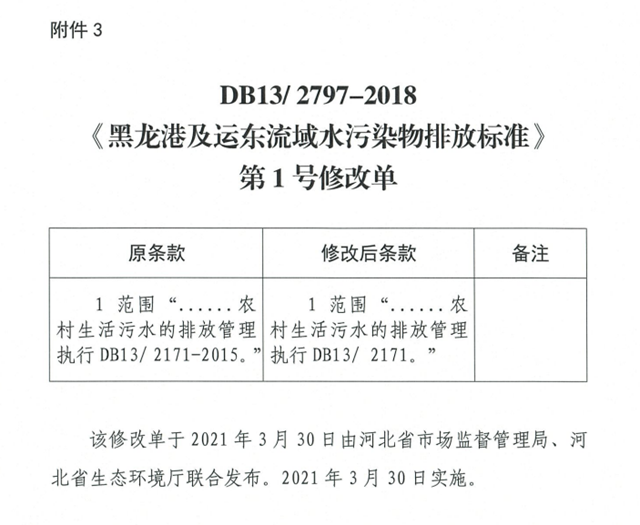 3.DB13/ 2797-2018《黑龍港及運東流域水污染物排放標(biāo)準(zhǔn)》第1號修改單