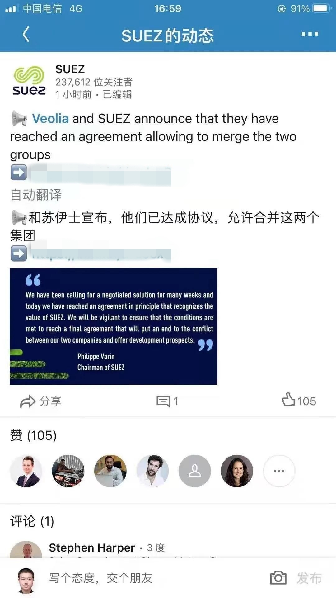 該協(xié)議將從工業(yè)和社會的角度出發(fā),創(chuàng)建新的蘇伊士公司,該公司的資產(chǎn)由一個連貫的,可持續(xù)的部門組成,并具有真正的增長潛力,營業(yè)額約為70億歐元;通過蘇伊士收購要約,威立雅創(chuàng)造了生態(tài)轉(zhuǎn)型世界冠軍的計(jì)劃的實(shí)施,該交易的銷售額約為370億歐元,其中仍將保留威立雅確定的所有戰(zhàn)略資產(chǎn)等。