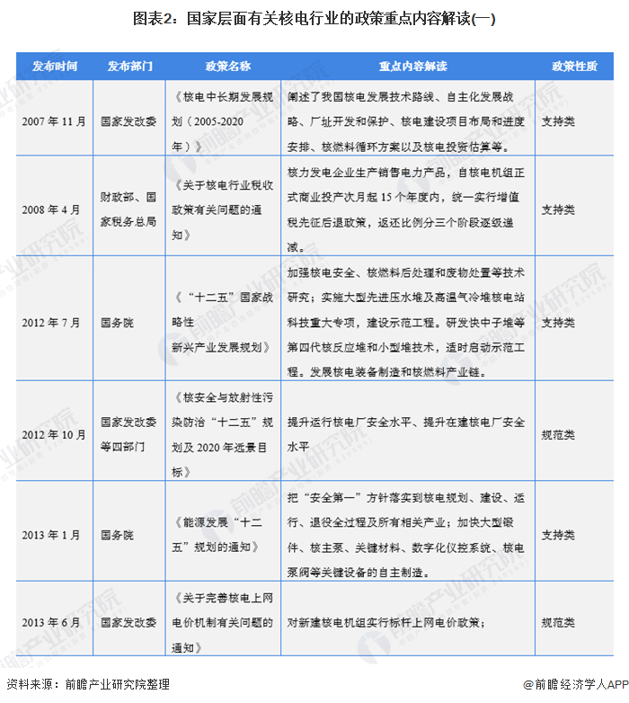 自2007年以來,國務院、國家發(fā)改委、國家能源局等多部門都陸續(xù)印發(fā)了支持、規(guī)范核電行業(yè)的發(fā)展政策,內容涉及核電發(fā)展技術路線、核電廠建設規(guī)范、核電廠安全運行規(guī)范、上網(wǎng)電價政策等內容: