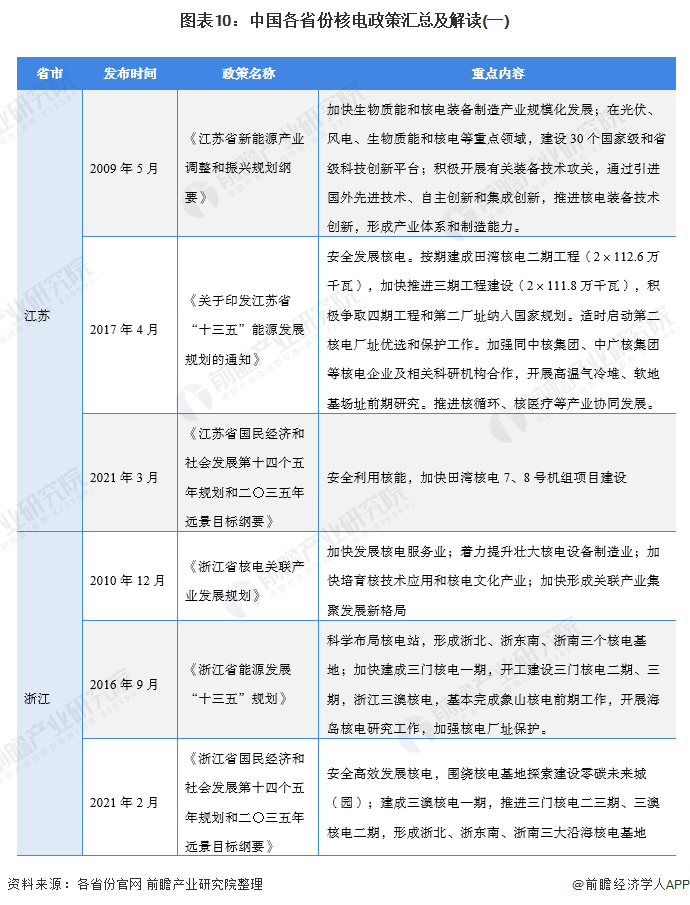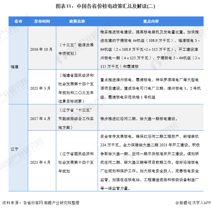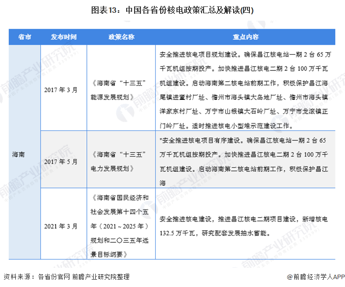 現(xiàn)有或規(guī)劃在建的核電站省份包括:江蘇、浙江、福建、山東、遼寧、廣西、廣東和海南,各省份均在“十三五”、“十四五”時期發(fā)布了推動核電建設的支持性政策,政策內容均落實了“安全高效發(fā)展核電產業(yè)”的主旨: