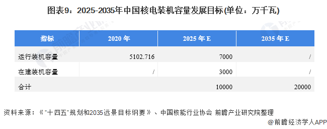 此外,根據(jù)中國核能行業(yè)協(xié)會發(fā)布的《中國核能年度發(fā)展與展望(2020)》中的預測數(shù)據(jù)顯示,到2025年,我國在運核電裝機達到7000萬千瓦,在建3000萬千瓦;到2035年,在運和在建核電裝機容量合計將達到2億千瓦;核電建設有望按照每年6至8臺機組穩(wěn)步推進。