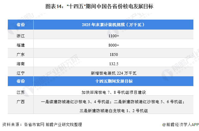 “十四五”期間,我國主要省份也提出了核電行業(yè)的發(fā)展目標。其中,浙江、福建、廣東和海南均提出了至2025年末的核電裝機規(guī)模,遼寧提出在“十四五”期間將新增核電裝機224萬千瓦。此外,江蘇、廣西雖未公布裝機規(guī)模目標,但也提出了核電項目的建設目標或規(guī)劃: