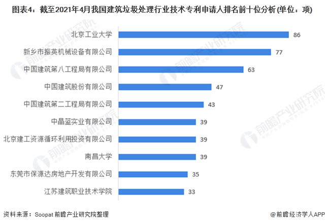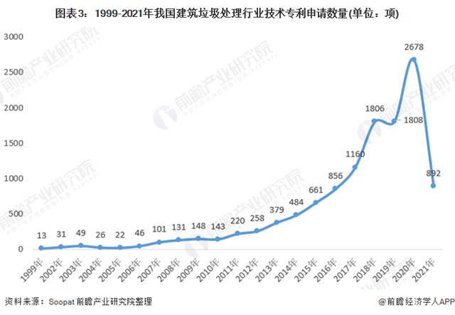 據(jù)前瞻在專利信息服務平臺Soopat統(tǒng)計, 2020年為2678項,截至2021年4月,我國建筑垃圾處理行業(yè)技術專利申請數(shù)量共892件。