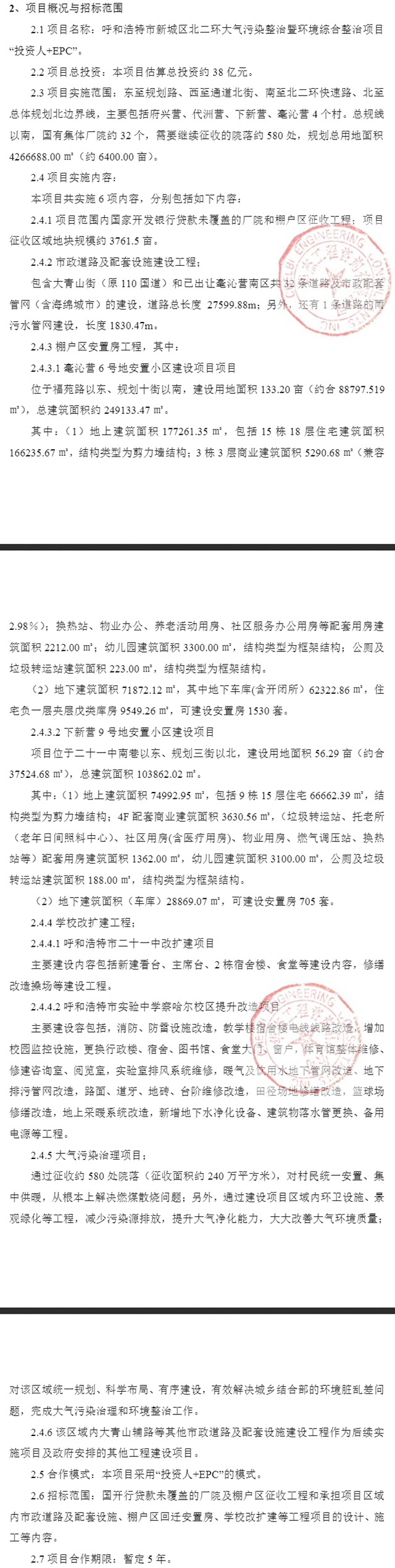 項(xiàng)目位于呼和浩特市新城區(qū),東至規(guī)劃路,西至通道北街,南至北二環(huán)快速路,北至總體規(guī)劃北邊界線,規(guī)劃總用地面積約4.3平方公里,擬采用 ABO+EPC 的運(yùn)作模式實(shí)施,主要合作內(nèi)容包括廠院和棚戶區(qū)征收工程、市政道路及配套設(shè)施建設(shè)工程、棚戶區(qū)安置房工程及學(xué)校改擴(kuò)建工程、大氣污染治理項(xiàng)目。